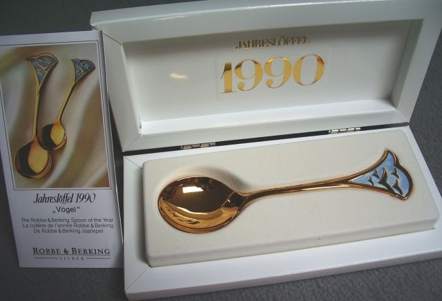 Sammlerobjekt - Seit 1969 gibt es den Jahreslöffel von Robbe und Berking. Jahr für Jahr wird von Künstlerhand ein neuer Jahreslöffel geschaffen. Kleine Kunstwerke, von Künstlerhand entworfen, in Sterlingsilber geschmiedet, von Hand emailliert und vergoldet. Jeder ist ein selbständiges Kunstwerk und nicht nur eine Variation seiner Vorgänger. Das macht den besonderen Reiz und Wert aus. Dazu kommt eine begrenzte Herstellungszeit. R & B garantiert, daß der jeweilige Jahreslöffel nur 1 Jahr produziert wird und dann nie wieder - wie hoch auch der Wert älterer Jahrgänge gestiegen sein mag. Das macht den R&B-Jahreslöffel zum begehrten Sammlerobjekt.
