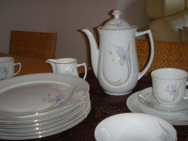12 Kaffeetassen mit 12 Untertassen, 1 Kaffeekanne mit Deckel, 1 Milchkännchen, 12 Kuchenteller, 6 Dessert / Salatschälchen, 6 Speiseteller, 5 Suppenteller, 1 großer Platzierteller, Motiv: blaue Orchidee, überall Goldrand, einwandfreier sehr guter Zustand, über 50 Jahre alt, Selbstabholung