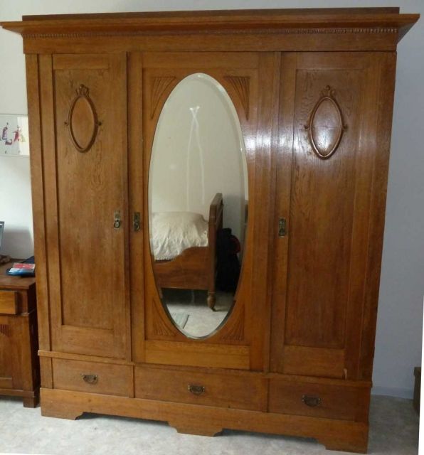 Verkaufe diesen schön geräumigen Kleiderschrank. Er ist 3-türig mit einem ovalen Spiegel in der Mitteltür. Die unteren Schubfächer sind nur außen sichtbar, innen verbirgt sich großer Stauraum dahinter.