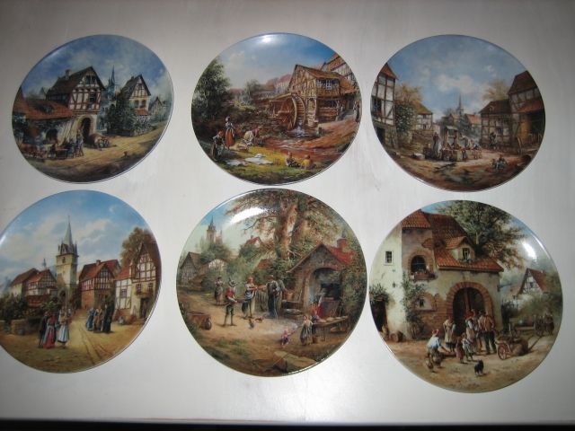 Porzellan Künstler Puppe - Clean as a Whistle6 Wandteller Serie Romantisches Dorfleben zu verkaufen, Auszug von der Rückseite der Teller: präsentiert von Eleonore Guinther, Reichenbach verewigt das Originalgemälde in einer auf 75 Brenntage limierten Auflage auf feinem Porzellan, alle T eller haben eine Teller Nr.und BRADEX Nr.